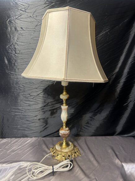 Duża lampa stołowa z onyksu i zdobionego mosiądzu z abażurem – klasyczna elegancja