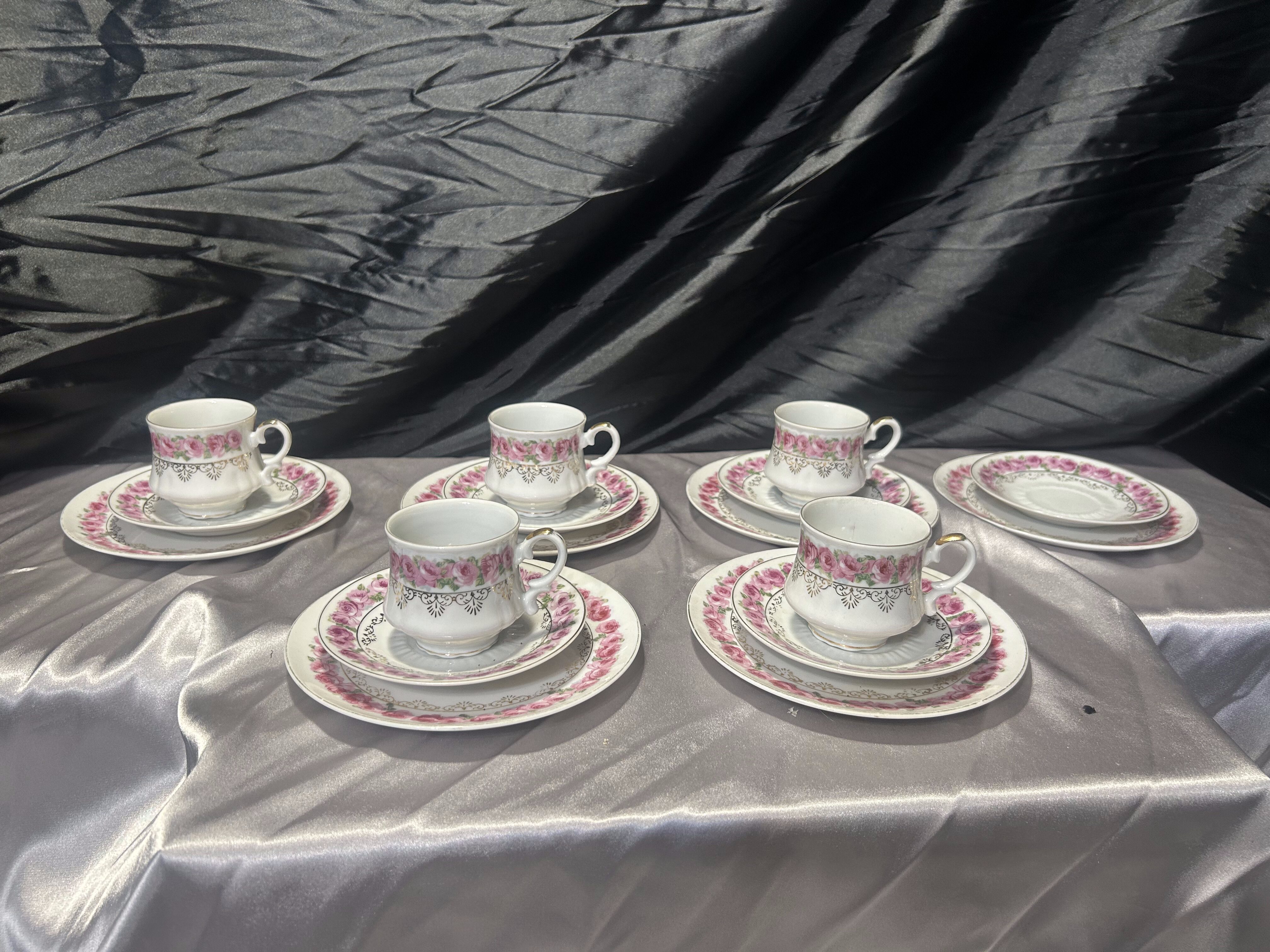 Zestaw porcelany – filiżanki Trio z różowym kwiecistym wzorem – komplet 5 sztuk