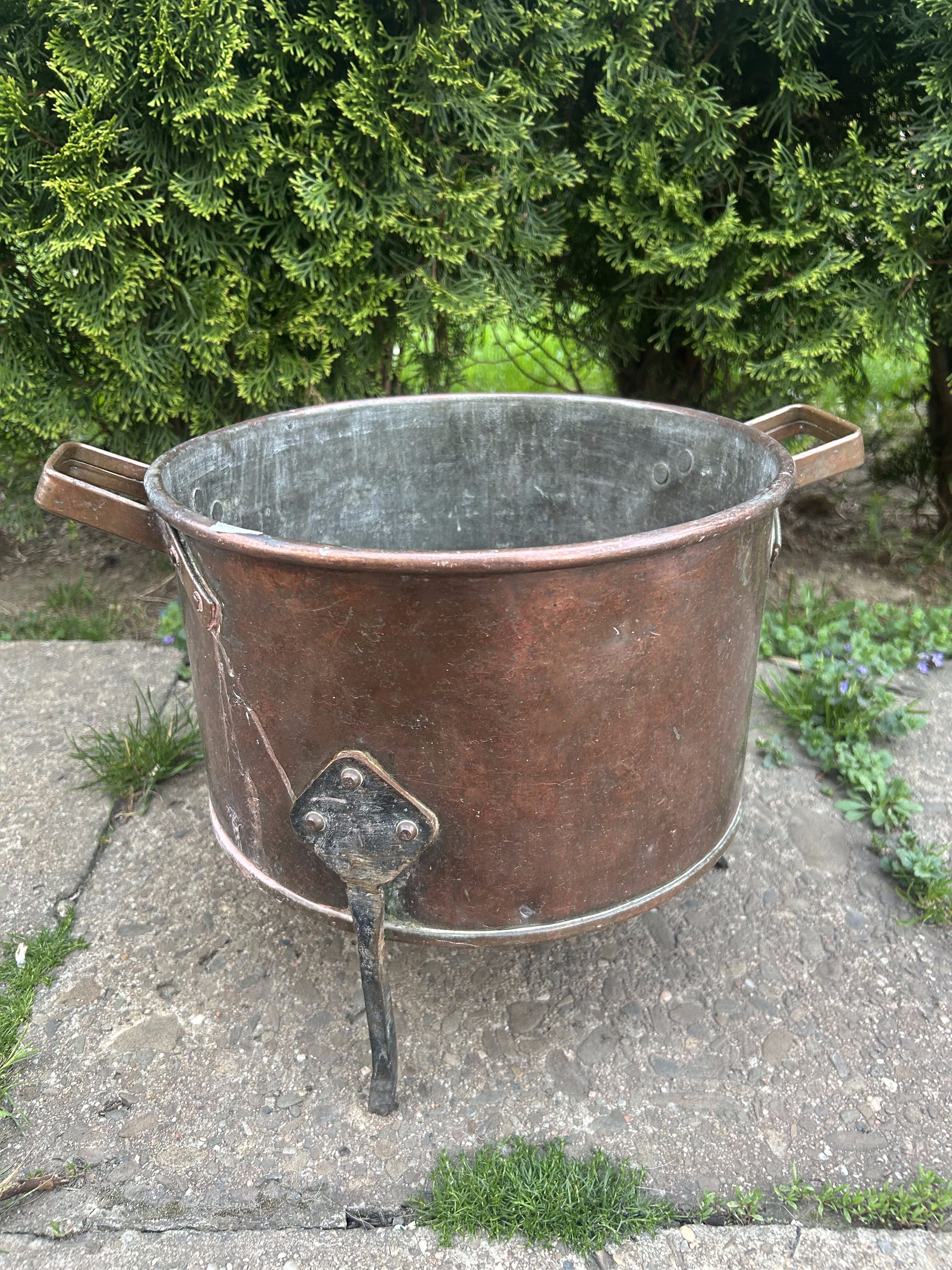 Ogromny miedziany garnek – z kutymi uchwytami i podstawą – rzadki egzemplarz