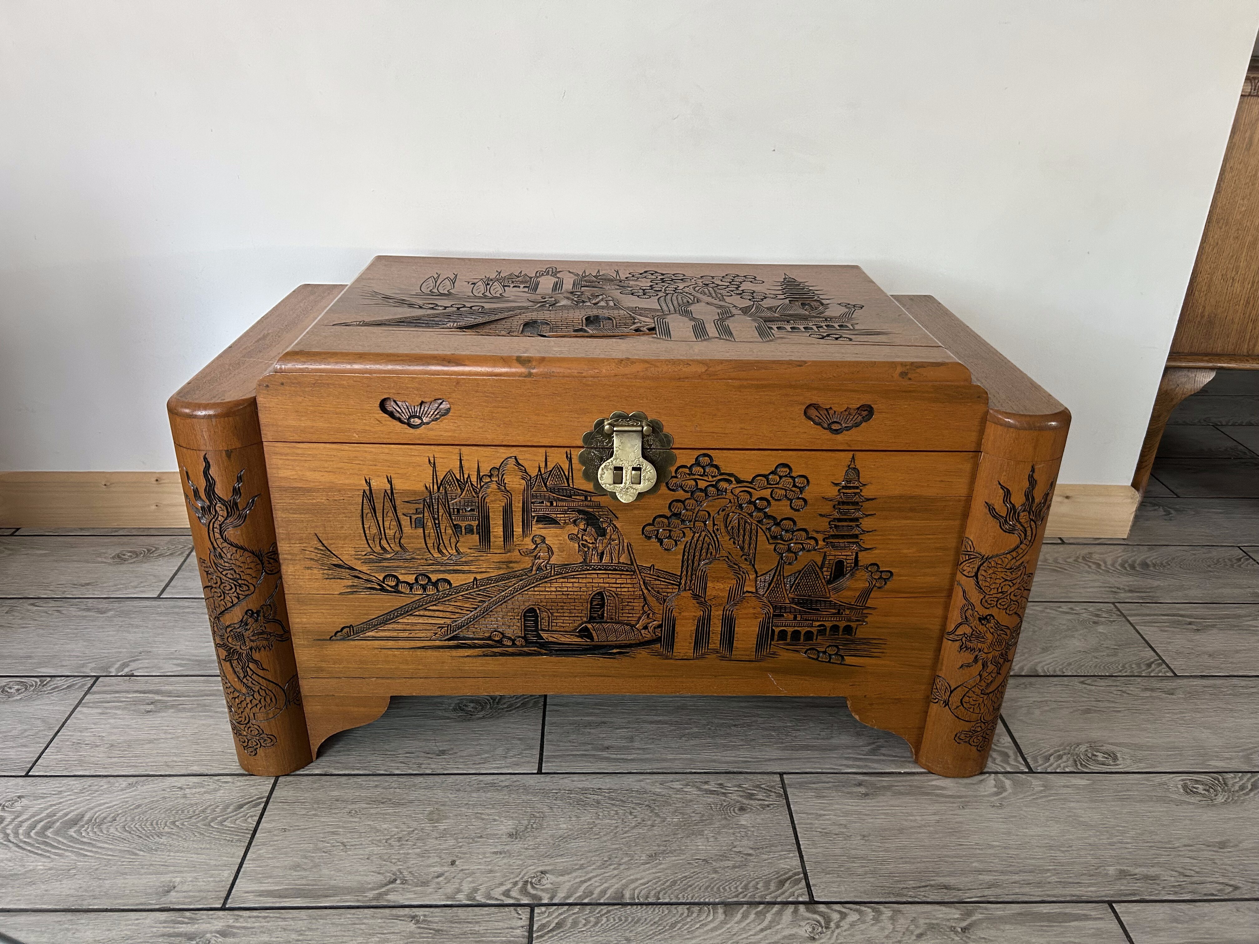 Drewniany kufer rzeźbiony – Kultura Wschodu – Motyw smoka i marynistyczny