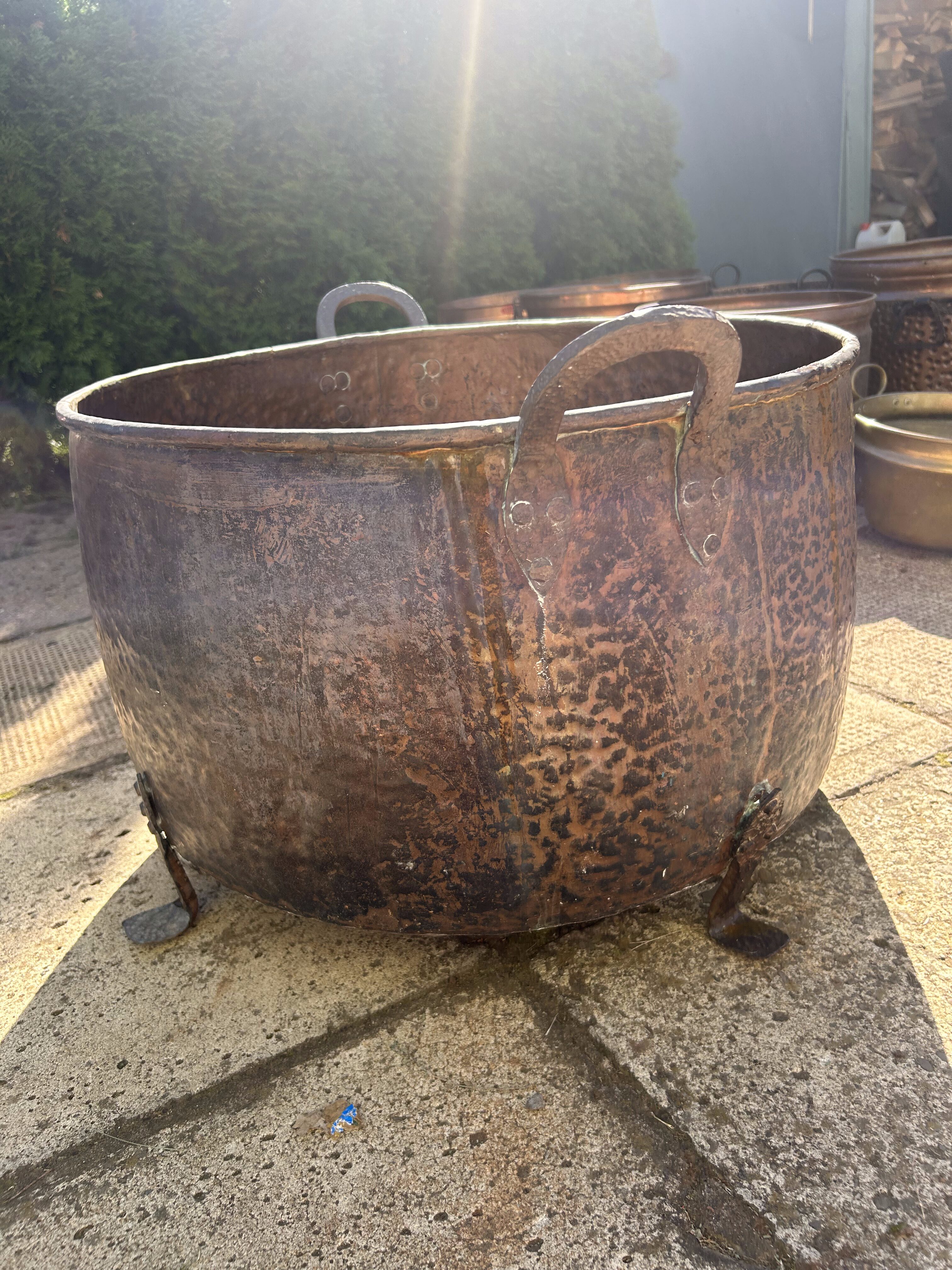 Ogromny miedziany garnek – z kutymi uchwytami i podstawą – rzadki egzemplarz