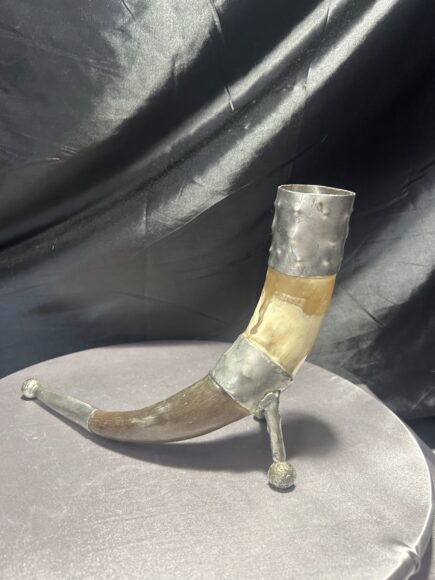 Ozdobny róg z nóżkami z cyny – dekoracyjny eksponat – naturalny róg