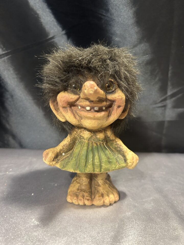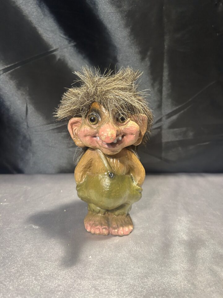 Troll z rękami w zielonych spodenkach – norweska figurka, pamiątka z Norwegii