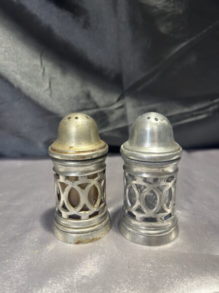 Zestaw solniczka i pieprzniczka – zdobione, sygnowane – srebrny kolor