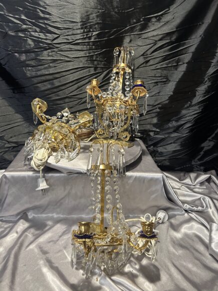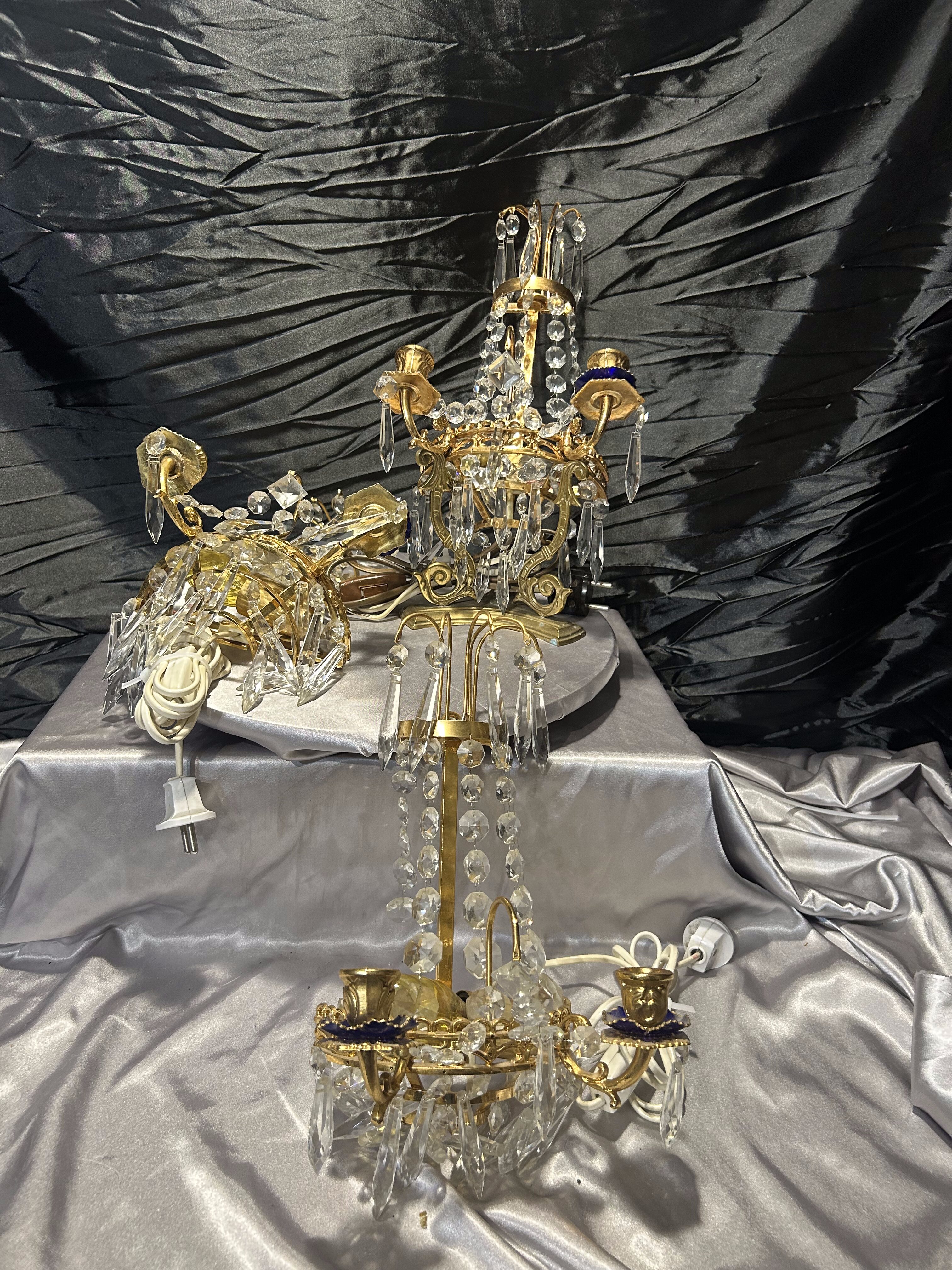 Zestaw trzech kinkietów glamour – złoto i kryształki – funkcja elektryczna i świecznikowa