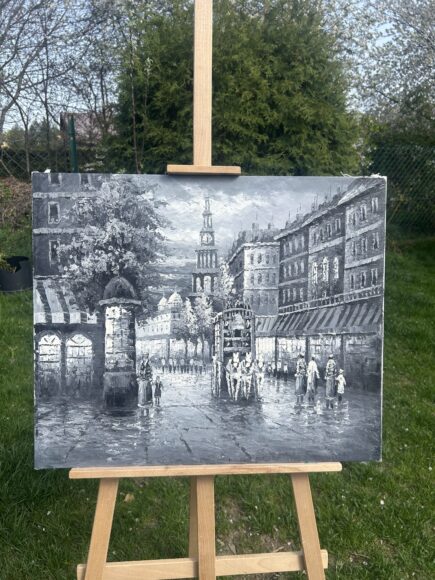 Obraz olejny – Uliczka z lat 20-tych – Czarno-biały – Malowany szpatułką